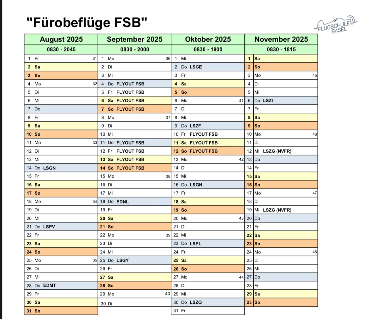 Jeweils an den angegebenen Donnerstagen um 16:00 Uhr findet ein gemeinsames Briefing bei der FSB statt.